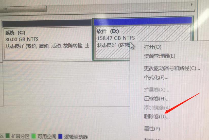 点击左侧 磁盘管理 右侧看到的D盘 鼠标右键点击 删除 (有文件的需要提前备份)